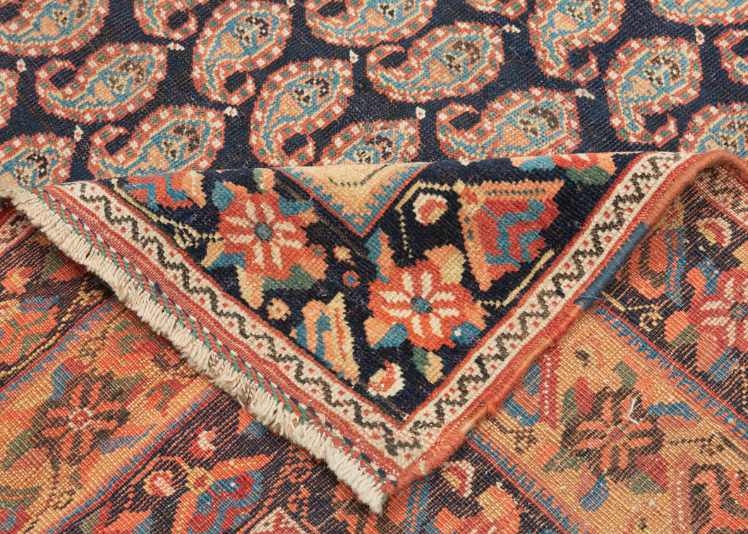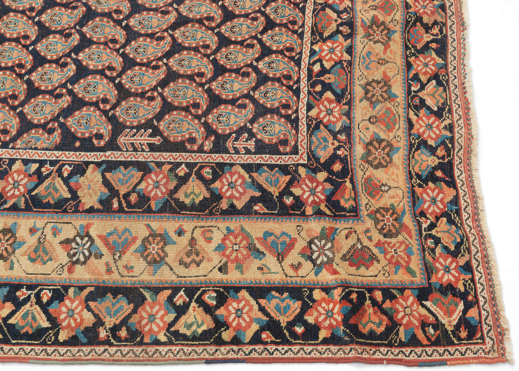 A beautifully composed Afshar rug featuring a classic allover boteh field, each sprouting motif rendered with crisp definition against a deep indigo (almost black) ground. The botehs are arranged in tightly organized rows, creating a shimmering, textile-within-textile effect that rewards close looking. Subtle shifts in dye tone animate the surface, giving the field a sense of depth and movement.
