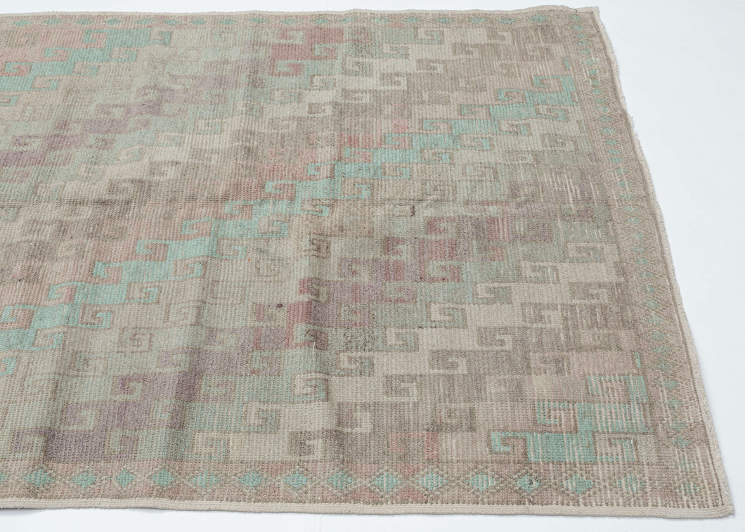 A beautifully washed Konya rug with a softly muted field and understated geometric patterning. Pale celadon, blush, and lavender tones drift across the surface, creating a gentle, watercolor-like effect. The classic stepped Seljuk design remains visible beneath the patina, providing quiet structure without visual weight.