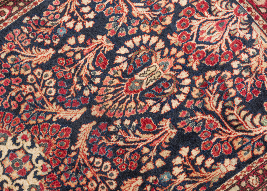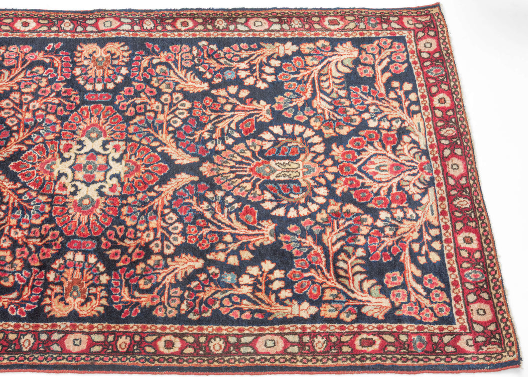 This finely woven Sarouk exemplifies the lush floral language that made the region’s carpets among the most sought-after of 1920s. Set against a deep midnight-blue ground, an intricate lattice of scrolling vines, palmettes, and rosettes unfolds with remarkable density and clarity, anchored by a subtle central medallion that gives structure to the otherwise allover composition.