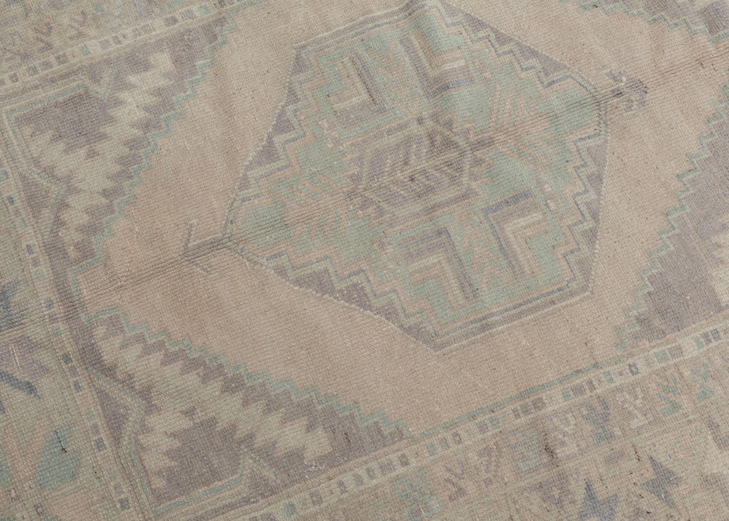 A softly washed Oushak with a luminous, pale field and gently articulated geometric medallion. Muted celadon, faded lavender, and warm ivory tones blend seamlessly, creating an airy, time-softened surface with subtle movement.