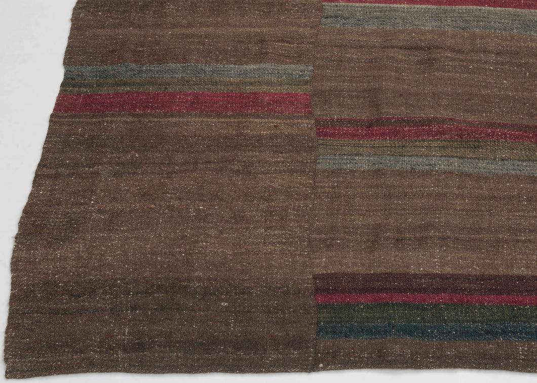The palette is grounded and earthy with warm browns enlivened by muted bands of madder red, indigo, slate blue, and soft celadon. The wool is dense yet pliable, with visible flecking that speaks to local sheep breeds and traditional spinning methods. Gentle abrash and uneven striping lend the textile a lived-in warmth rather than strict symmetry.