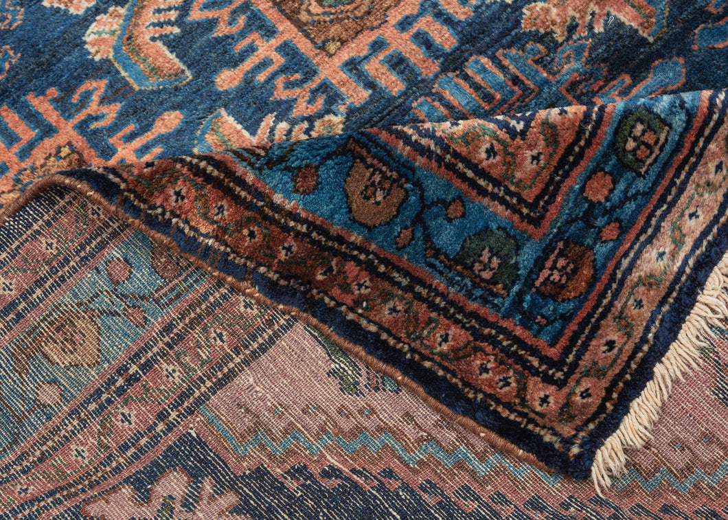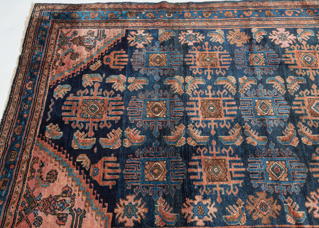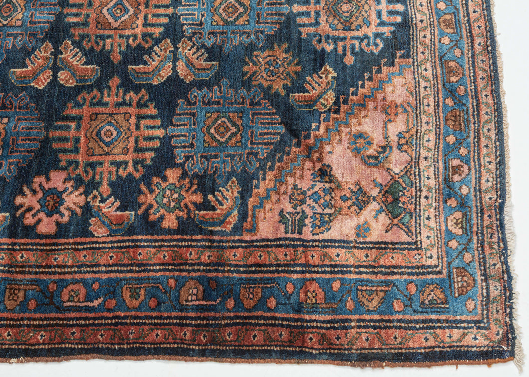 This Hamadan rug presents a classic village composition with a direct, confident hand. An allover design unfolds across a navy ground, featuring a fresh palette of earthy reds and rust tones balanced by indigo, soft ivory, and subtle accents of blue and green. Coral cornices brighten the field, while a fluid blue border frames the composition, flowing around the perimeter like a pool of water.