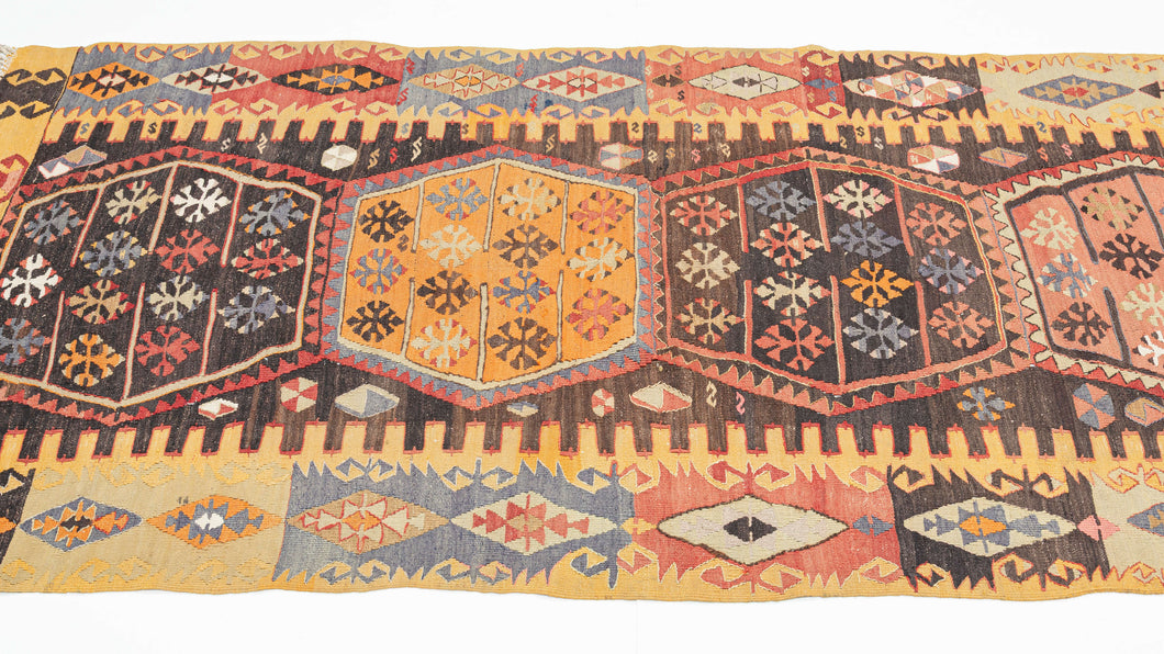 The panel’s lively palette and crisp slit-weave technique show the work of a skilled village weaver, while the long original fringes at both ends add authenticity and charm. Earthy, luminous, and boldly graphic, this is a classic example of the Malatya aesthetic.
