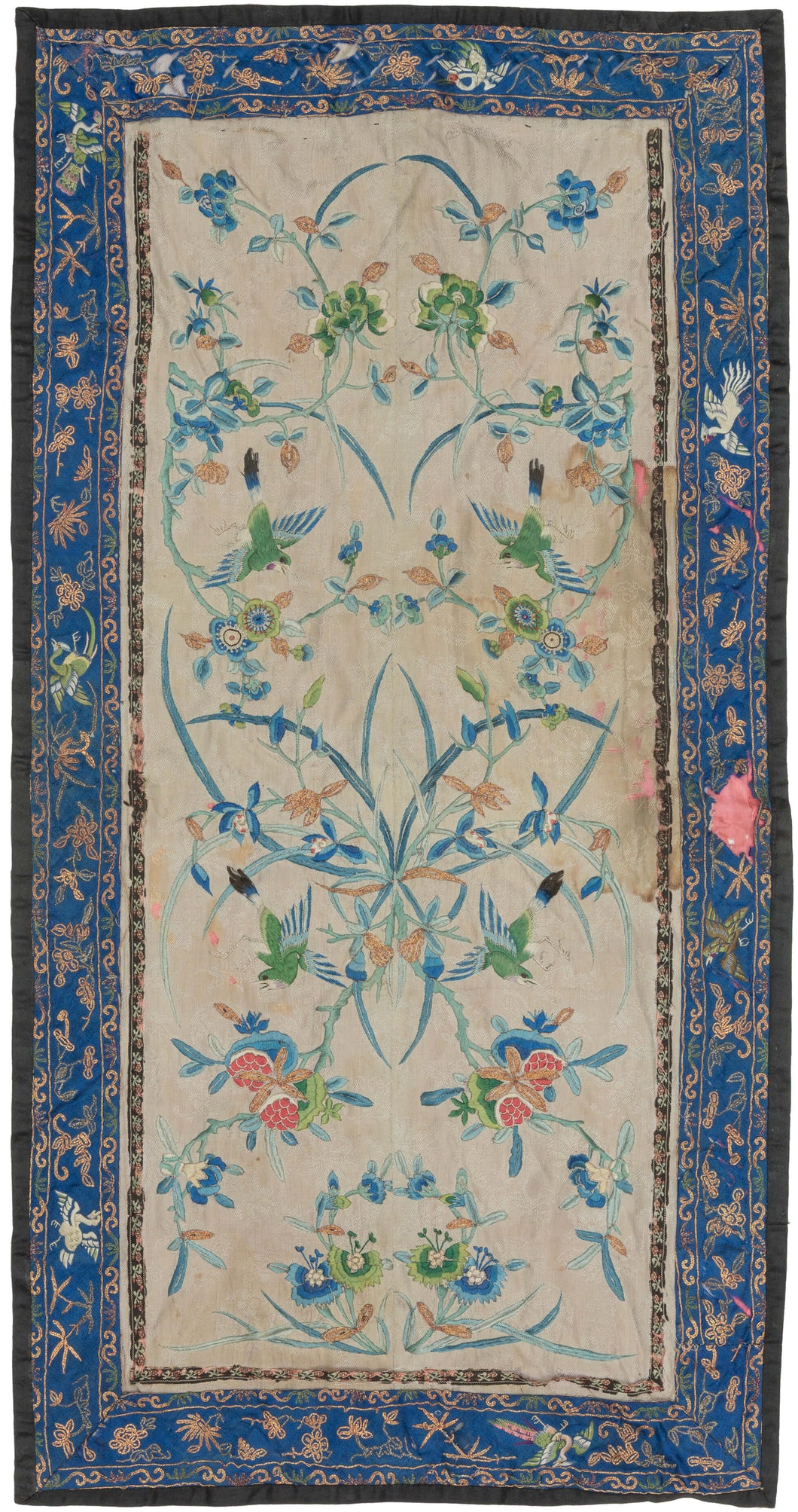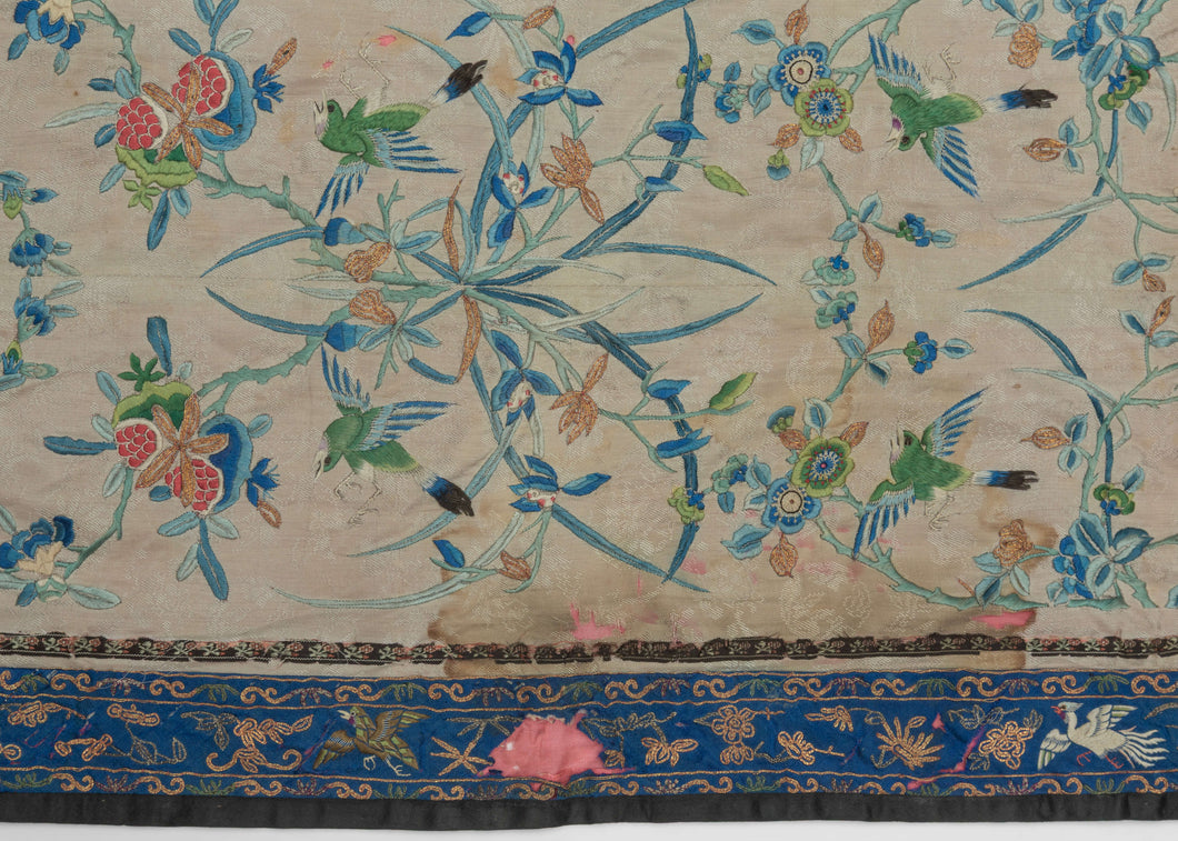 It features lively birds, flowers and fruits in blues, pinks and greens. It has a lovely blue border of multi-toned flowers and birds embroidered with silk and metal.
