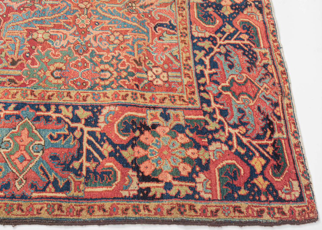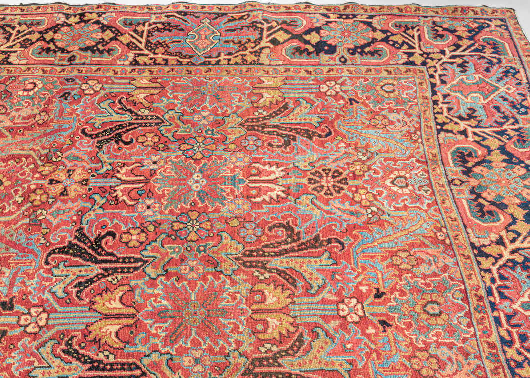 A richly patterned all-over Heriz with a dense field of stylized floral motifs arranged in horizontal bands, creating a continuous surface without a central medallion. Compared to more classical, sharply angular Heriz designs, the drawing here is softer and more whimsical, with rounded forms and a lively, almost textile-like flow.