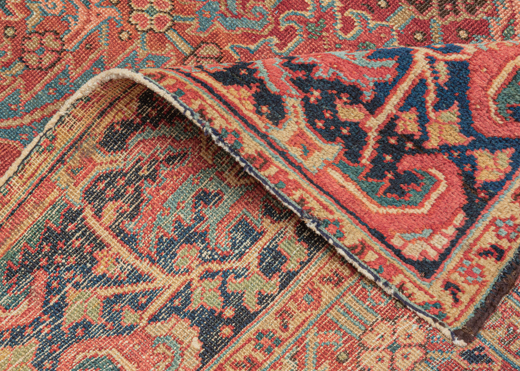 The palette of brick red, terracotta, indigo, teal, and ivory is well balanced and gently aged. Woven in wool pile on a cotton foundation, this is a durable yet decorative example, ideal for larger rooms where an even, immersive pattern is desired.