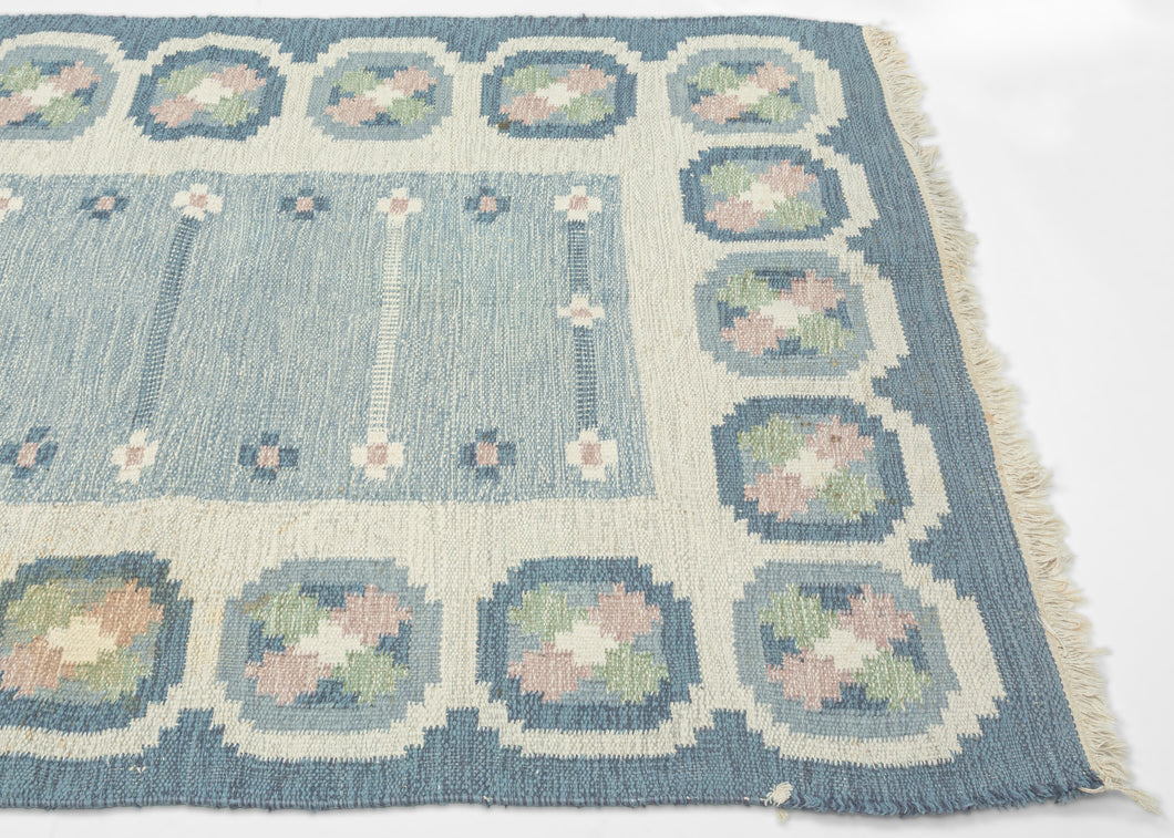 A refined mid-century Swedish flat weave by celebrated designer Ingegerd Silow, signed with her "IS" monogram in the lower right corner. Woven in soft glacier blues, cream, rose, and sage, this piece embodies the quiet elegance and warmth that define Scandinavian Modern textile design.