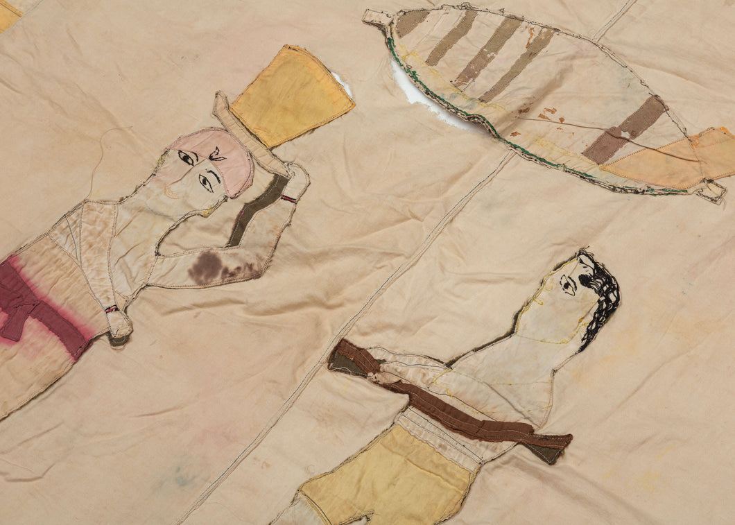 The restrained palette of cream, ochre, muted reds, and dark linework emphasizes the graphic clarity of the composition and the directness of the appliqué technique. A border of alternating yellow blocks frames the scene, finished with a knotted fringe that shows the wear expected of a banner carried in procession.